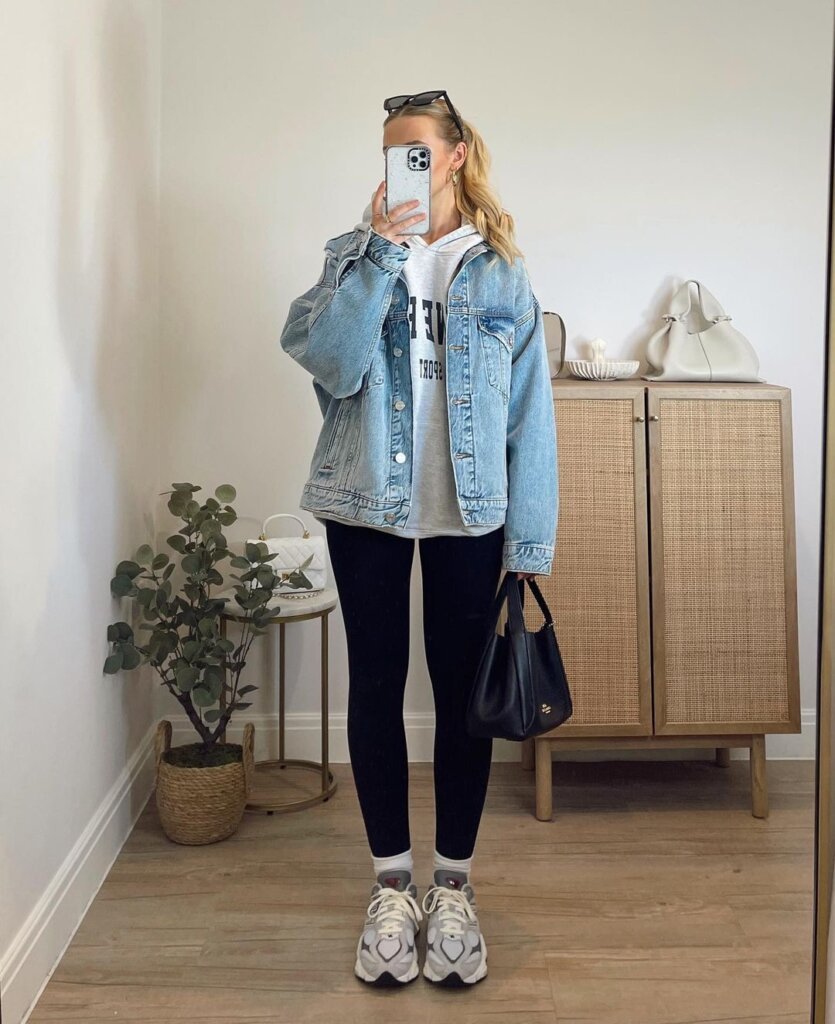 This is off-duty style done right. A denim jacket over a hoodie with sleek leggings feels practical, familiar, and oddly comforting.