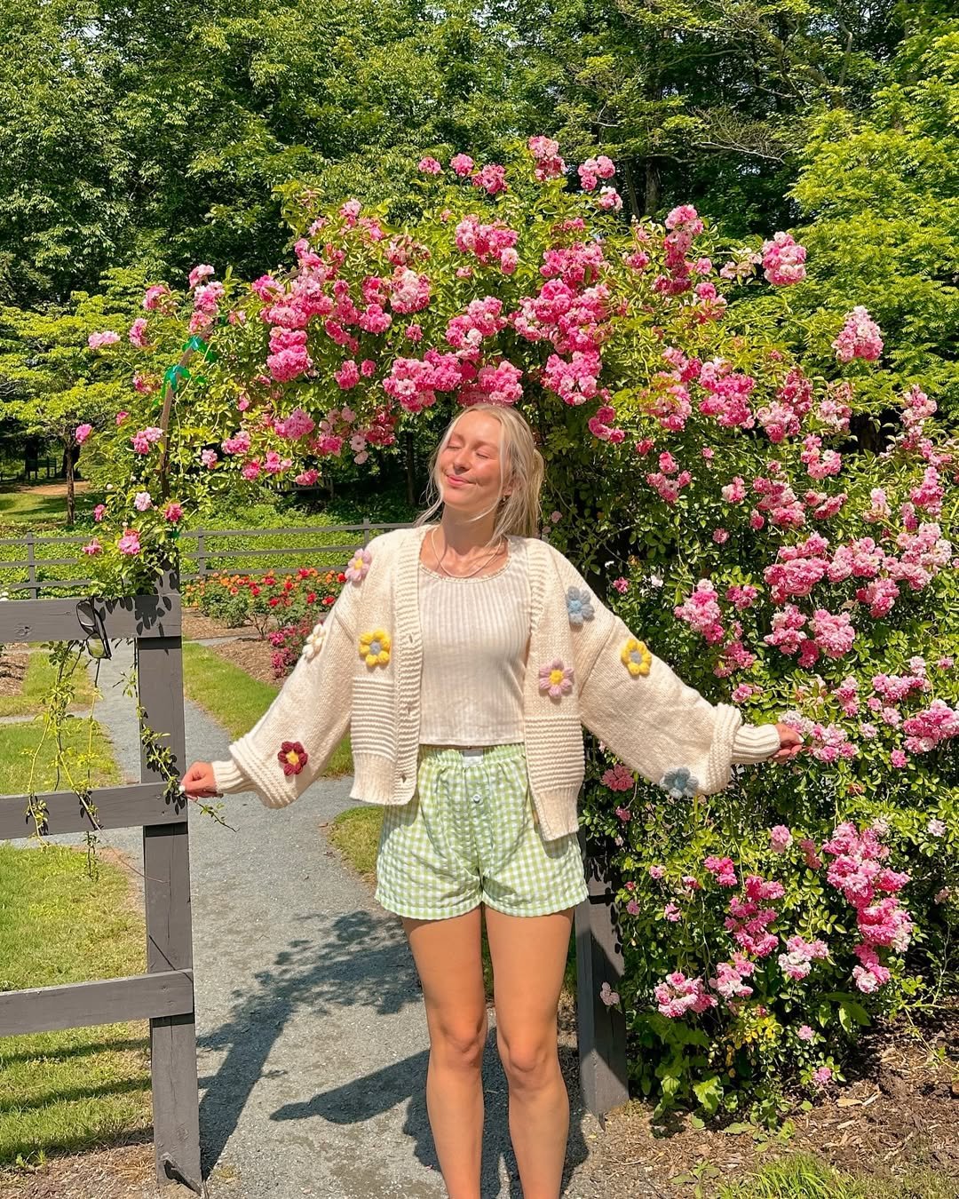 Soft textures and playful details make this outfit feel quietly joyful. The flower-dotted cardigan paired with gingham shorts leans into spring without feeling costume-y.