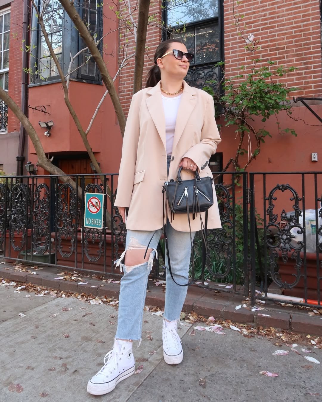 Blush tones meet downtown energy in this outfit that nails the balance of polished and playful. The oversized blazer feels slightly borrowed-from-the-boys, but the way it’s styled with ripped denim and crisp white high-tops keeps it very much her own.
