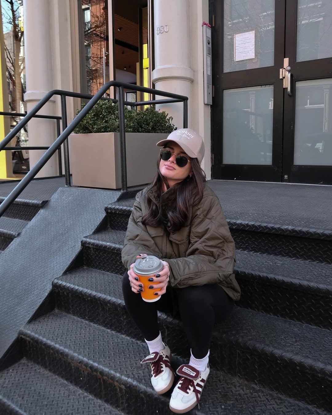 Sami’s look is the definition of “quiet cool.” A quilted olive jacket, ribbed leggings, and those signature Sambas create an effortless trio—like she didn’t try, but somehow looks better than everyone else.