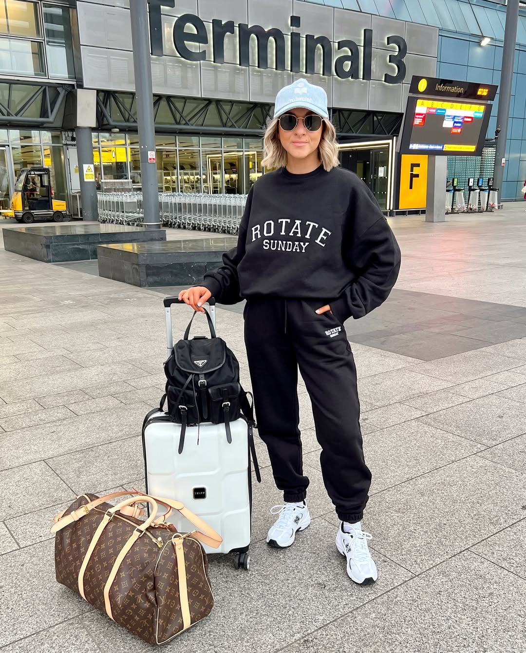Sweats—but make them luxury lounge. Elz rocks her “Rotate Sunday” set like she was born to do it, complete with crisp white kicks and the ultimate duo of travel bags (hello, Louis Vuitton + Prada). The baseball cap and round sunnies are a power couple all their own.