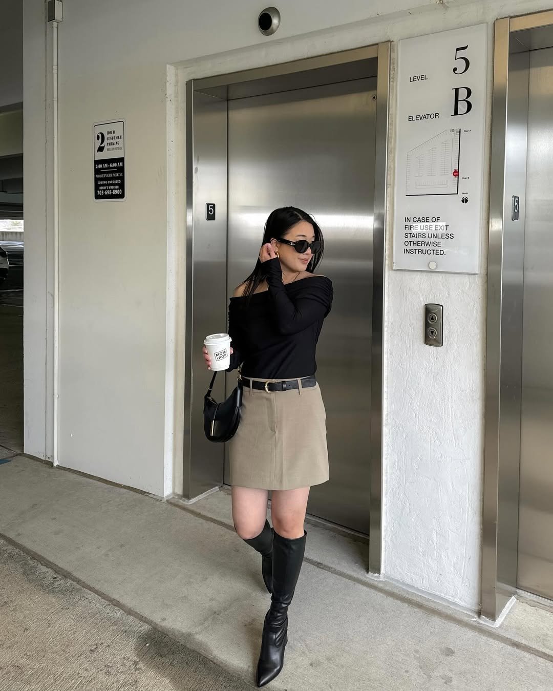 Tan skirt, black off-shoulder top, and knee-high boots—it’s a little French, a little minimal, and all kinds of stylish. The belt pulls it together, the coffee cup says she’s on the go, and the glossy sunglasses make it a whole vibe.