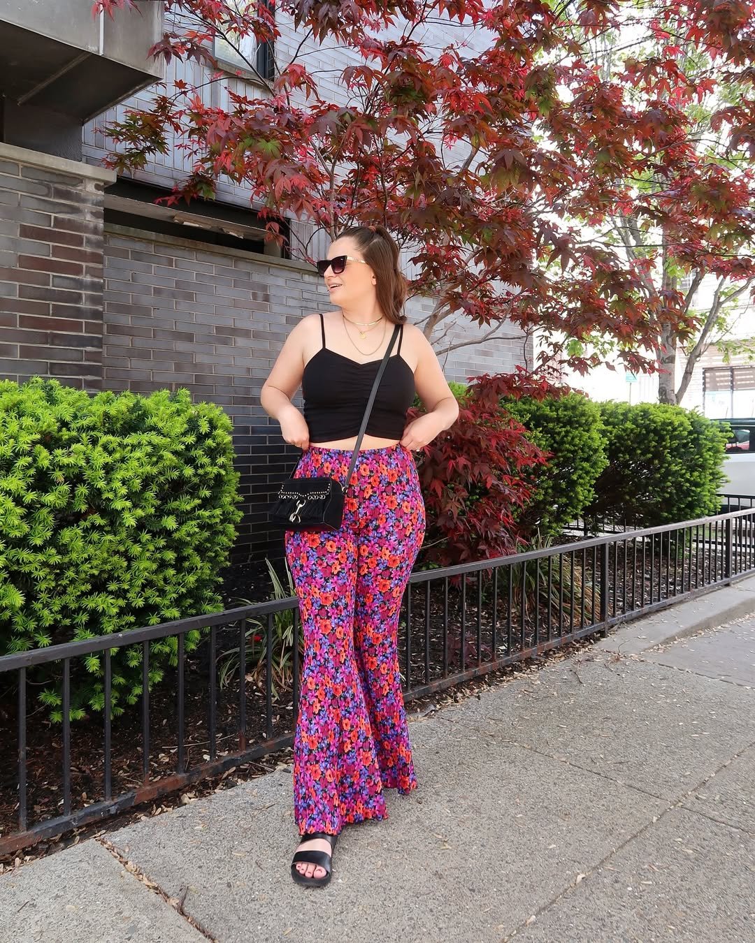 Bright, blooming, and unbothered. These bold floral trousers are pure serotonin—flowy, colorful, and full of personality. Paired with a classic black tank and minimal slides, they let the print do all the talking (and twirling).