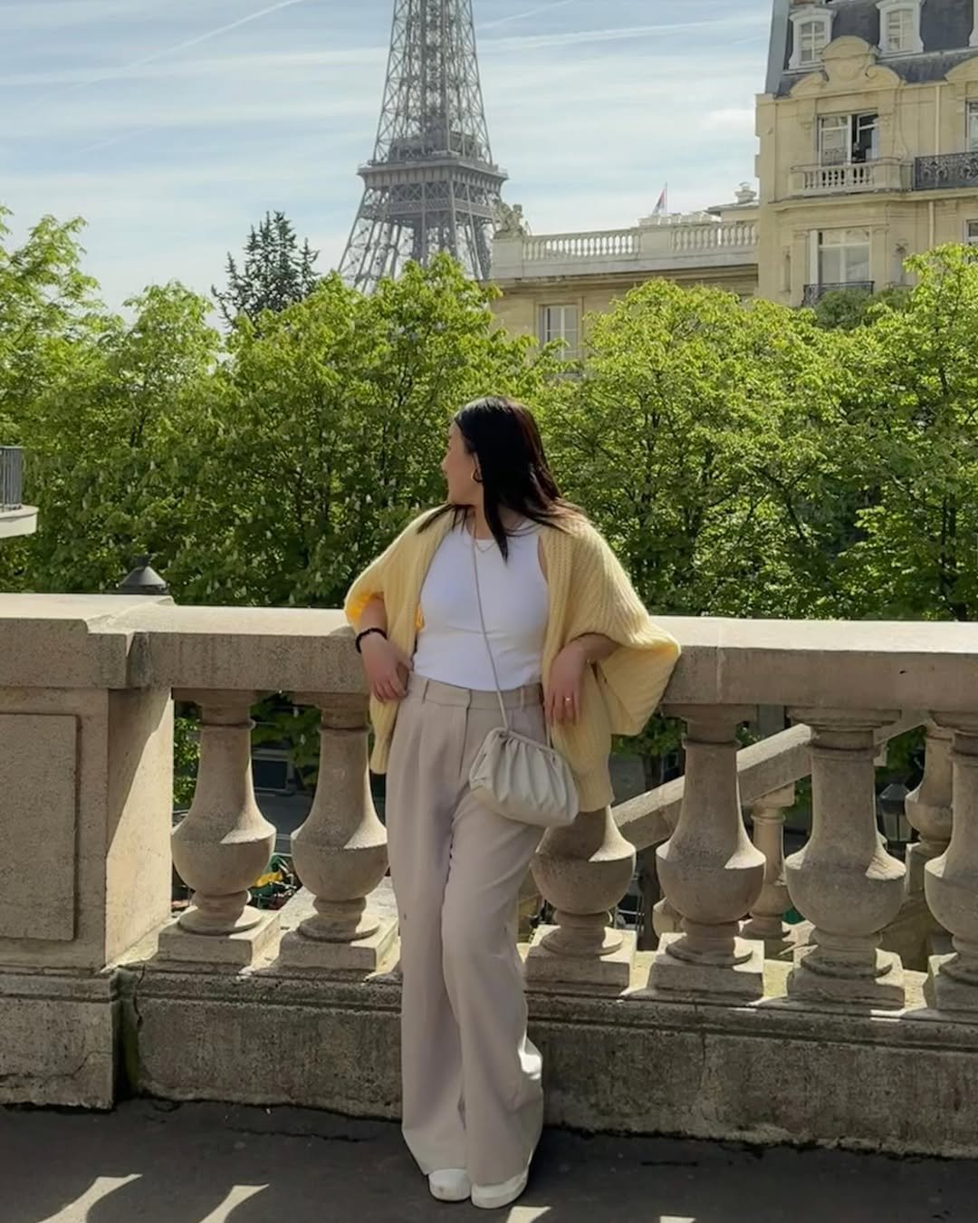 A lemon-yellow cardigan draped over wide-leg trousers brings softness to this Eiffel Tower moment. The white tank and creamy bag echo the light, while her stance—effortless, thoughtful—feels like she’s soaking in a moment worth remembering.