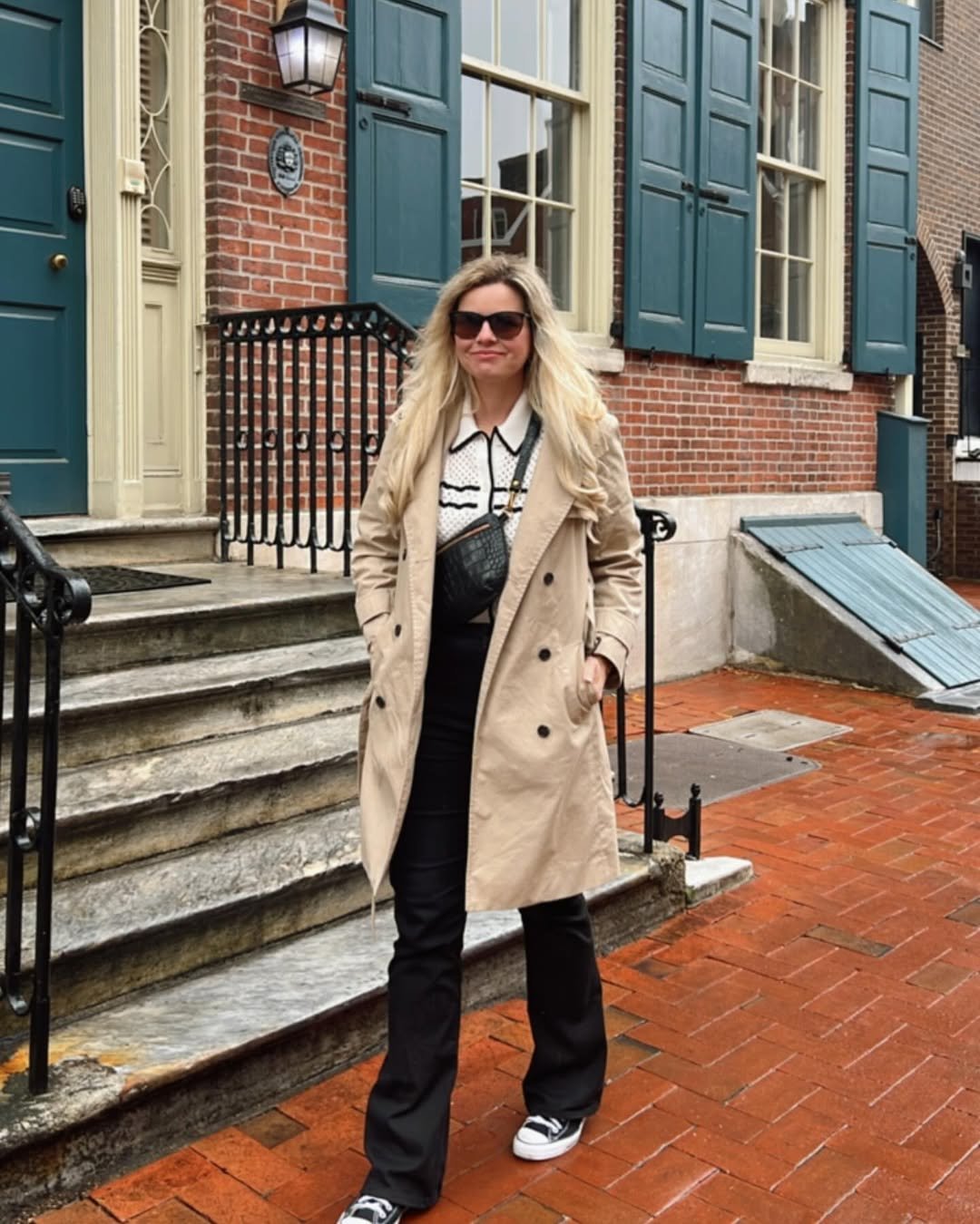 That crossbody bag tucked under the trench is a power move, and the retro sunglasses elevate the whole look. Whether she’s museum-bound or just chasing the best bakery in town, she’s doing it in style.