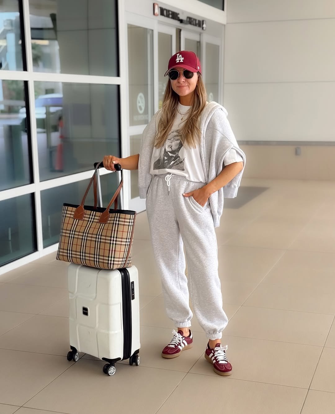 Nothing beats a good airport uniform, and this one hits all the right notes. A Celine tee tucked into black joggers, topped with a shoulder-draped sweater—chic but grounded. The oversized plaid tote and crisp white carry-on add polish, while the sandals say, “I’m breezing through TSA in style.”