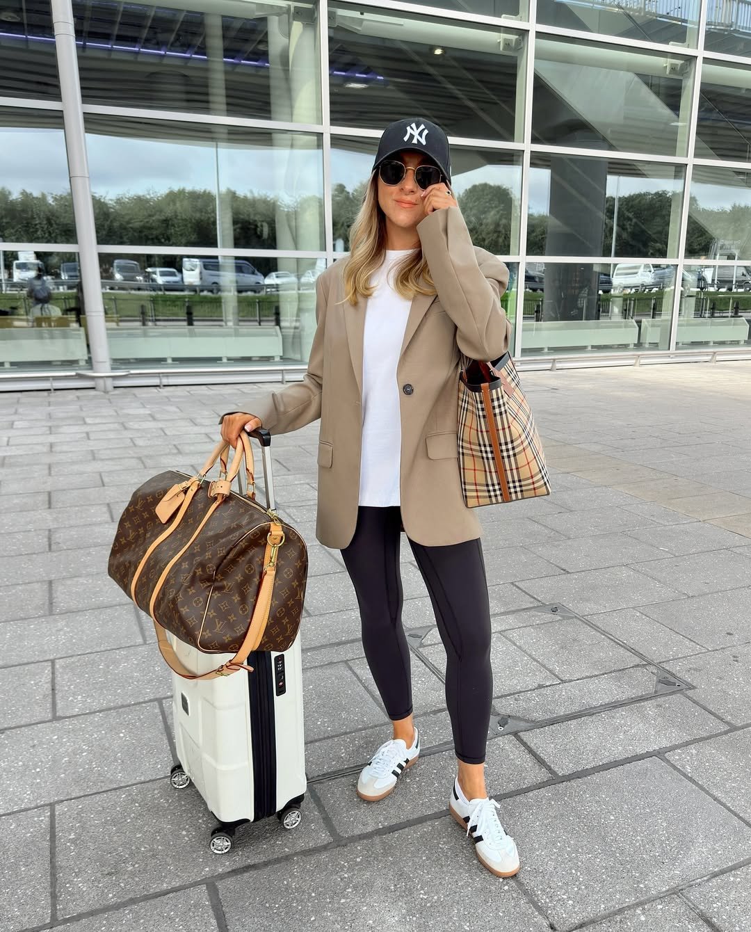 This one’s pure fashion-savvy traveler. Elz trades sweats for leggings, a crisp white tee, and a perfectly tailored blazer that pulls it all together. Her Louis Vuitton weekender slung over a sleek roller bag completes the look, while the cap keeps it grounded and casual.