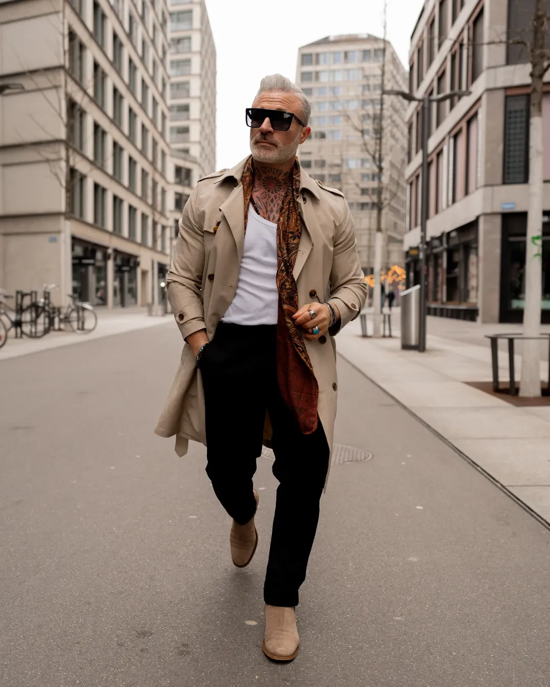 Trench coat, statement scarf, tailored trousers—this is personality dressing. The layered accessories and visible ink add edge, while the neutral coat keeps it grounded.