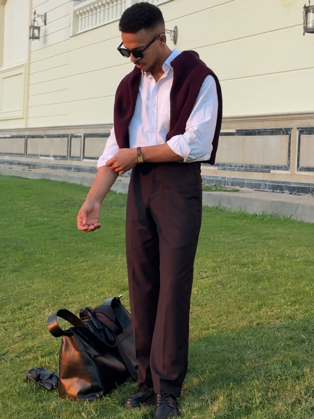 White shirt, deep burgundy knit draped over the shoulders, tailored trousers. It’s timeless with a touch of Ivy League flair. The roll of the sleeves keeps it relaxed and personal.