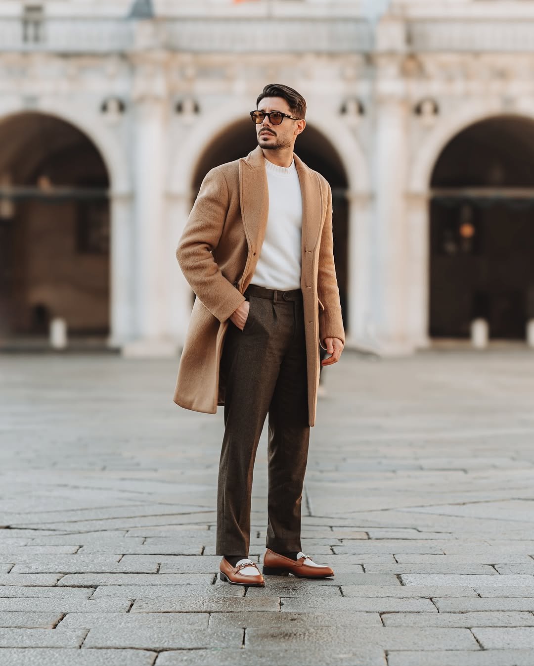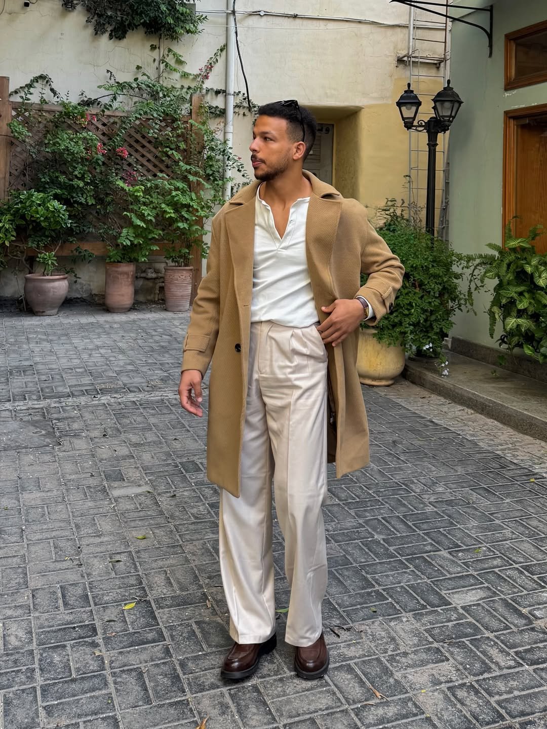 This camel overcoat over tonal neutrals is pure sophistication. The cream trousers elongate the frame, and those brown loafers subtly echo the warmth of the coat. Everything feels thought through.