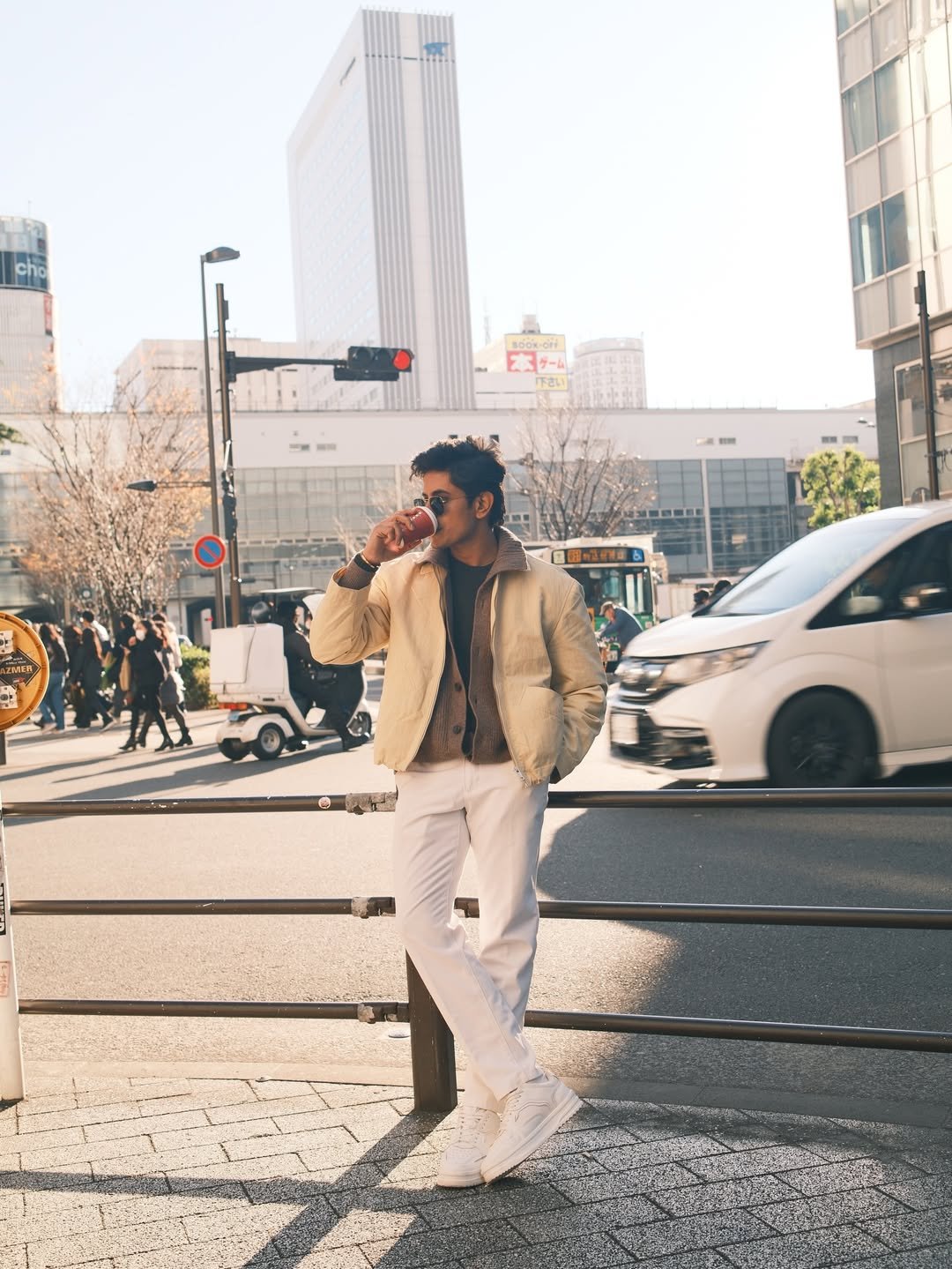 Light jacket, layered knit, crisp white trousers—this is how you do casual without slipping into sloppy. Even holding a coffee cup feels styled here.