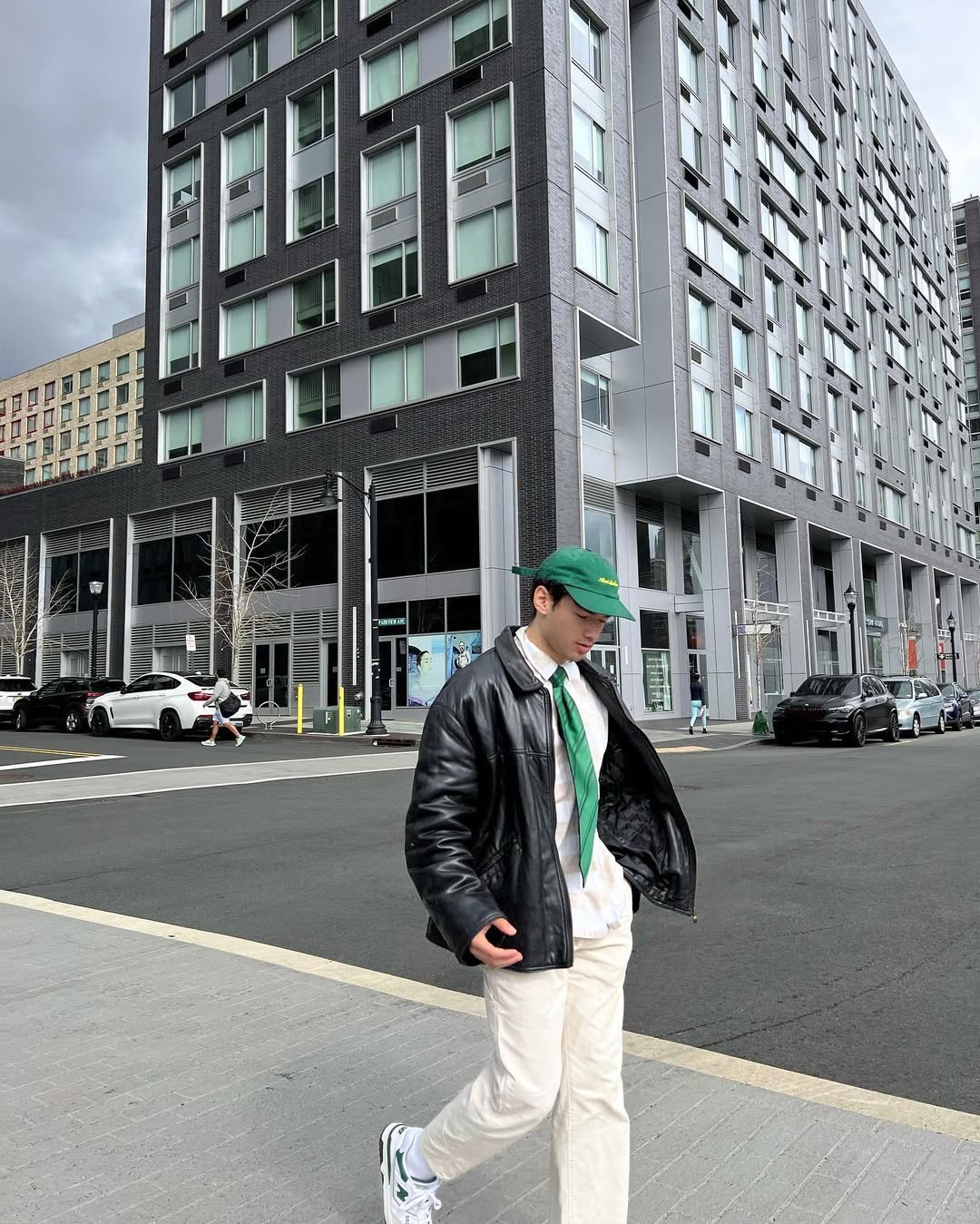 Black leather jacket, white shirt, green tie, cream trousers, and sneakers. It’s a little preppy, a little street, and completely current. The green cap tying into the tie? Smart move.