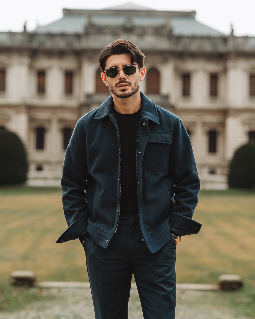This deep navy set against that historic backdrop? Cinematic. The structured jacket layered over black keeps it sleek, while the gold watch peeking through adds just enough polish.
