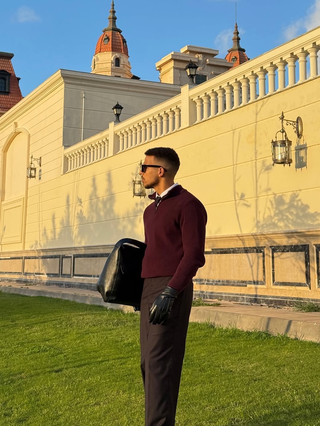 And that oversized black tote? Functional, but elevated. It feels like he’s on his way to something important—but still stopping for golden-hour photos. Effortless composure.