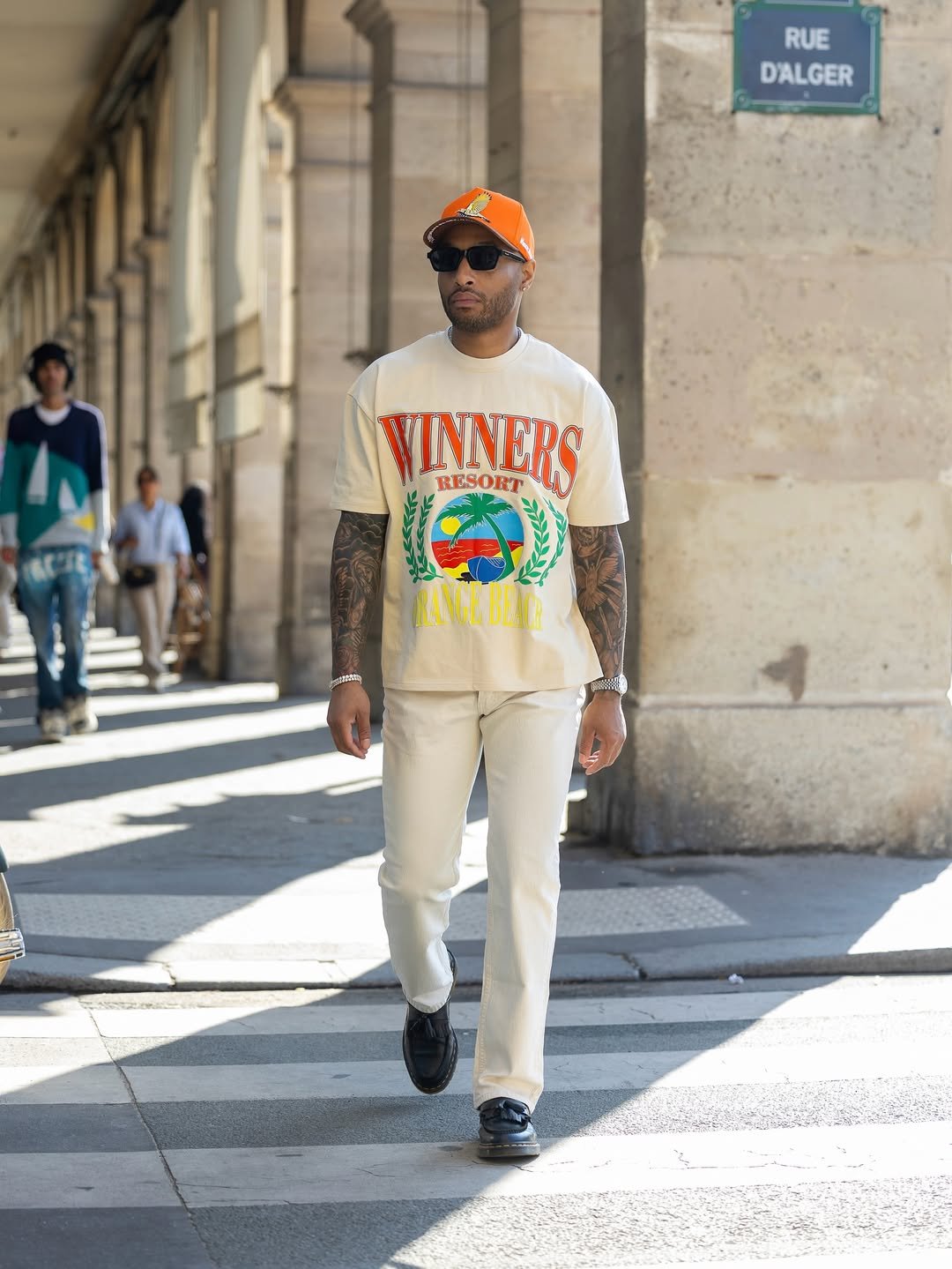 Cream tee with that vibrant graphic, paired with matching trousers and a bold cap—it’s playful without being messy. The black loafers anchor the look so it doesn’t drift too casual.