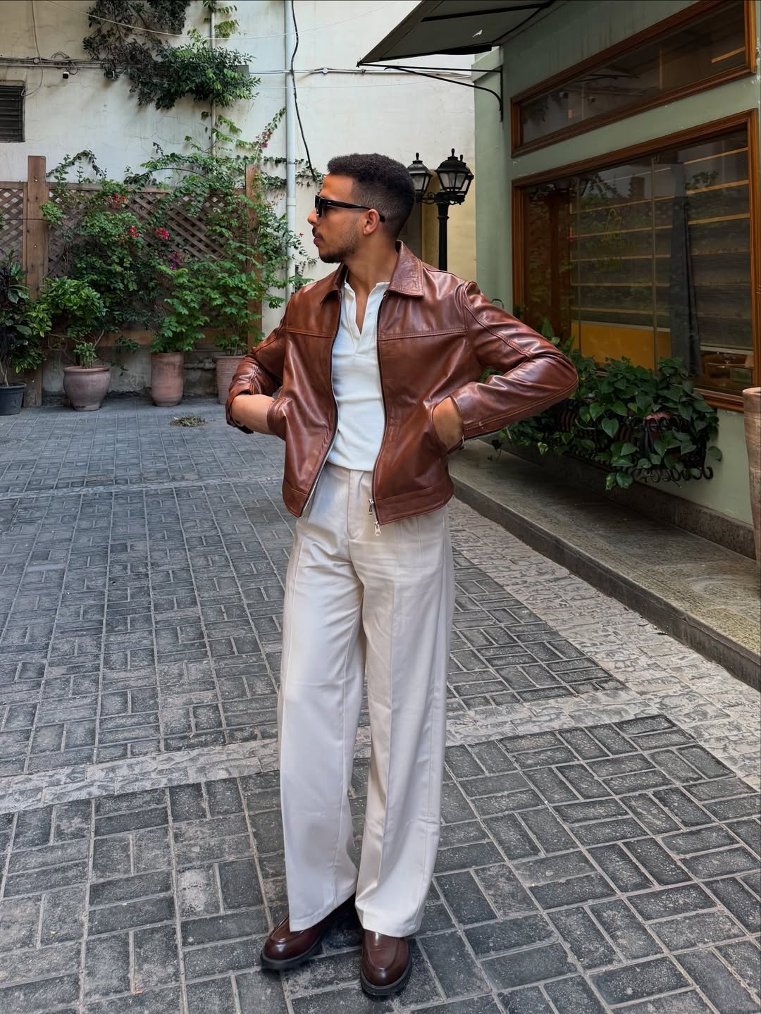 That brown leather jacket is doing heavy lifting—and doing it well. Paired with wide ivory trousers and a crisp open-collar shirt, it’s giving effortless European cool. Structured on top, fluid below. Perfect balance.