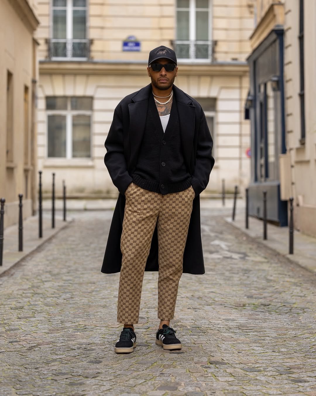 Monogram trousers with a black coat and sneakers? Risky on paper—but it works. The neutral top balances the bold pattern below.