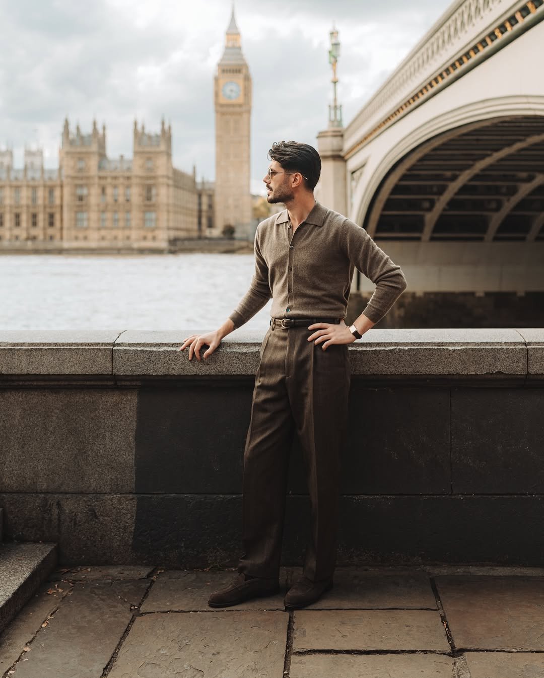 Brown knit polo, high-waisted trousers, and that riverfront setting with Big Ben in the background? Timeless. The earthy tones feel rich and refined without looking stiff.