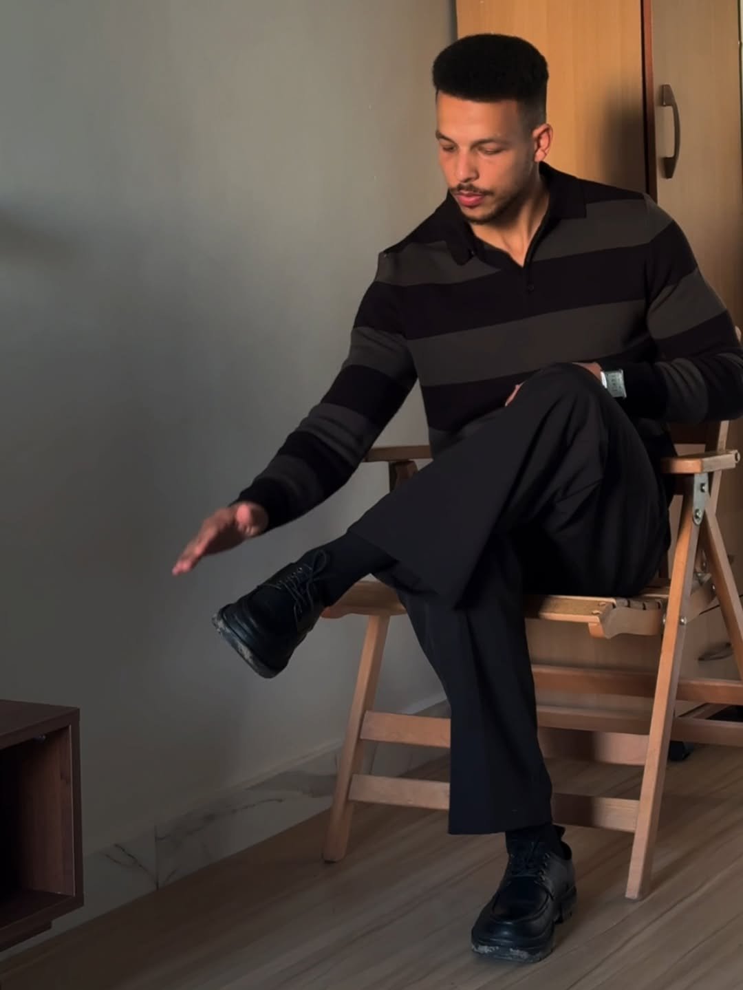 Black striped knit, tailored black trousers, sleek boots. This is monochrome done with texture. The subtle horizontal stripes break up the darkness just enough to add depth without distracting.