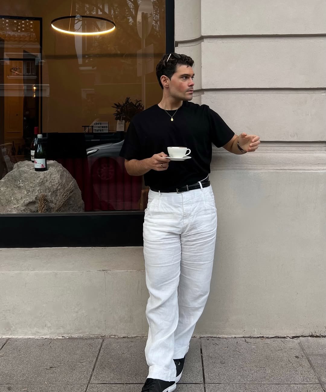 Black tee tucked into white trousers is a power move in its own quiet way. Clean lines, minimal palette, sharp contrast. It’s simple, but it doesn’t fade into the background.