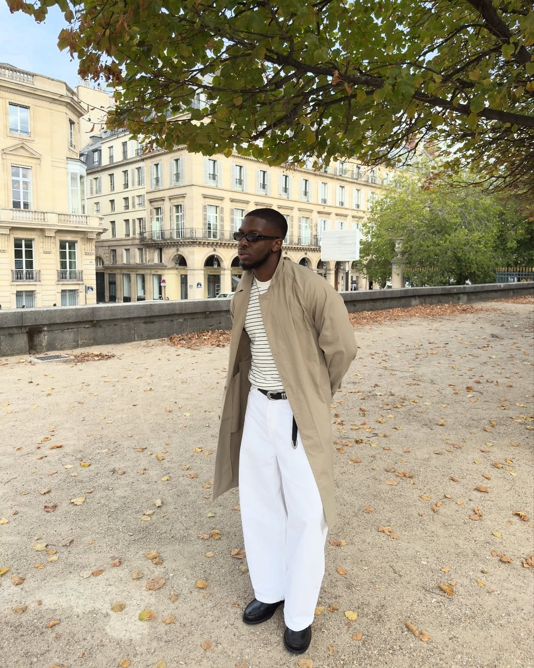 Beige trench, striped tee, white trousers. This is timeless territory. It’s crisp, refined, and just relaxed enough to feel current instead of classic-for-the-sake-of-it.