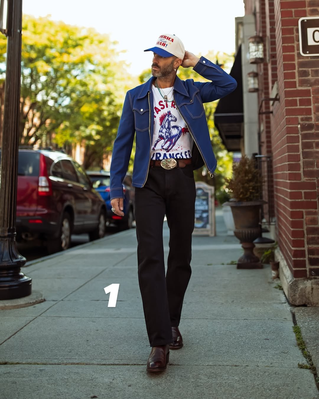 This is Americana with a twist. The bold graphic tee, western belt buckle, and tailored black trousers feel like a mashup of cowboy grit and city polish. And that blue jacket? It pulls everything together without trying too hard.