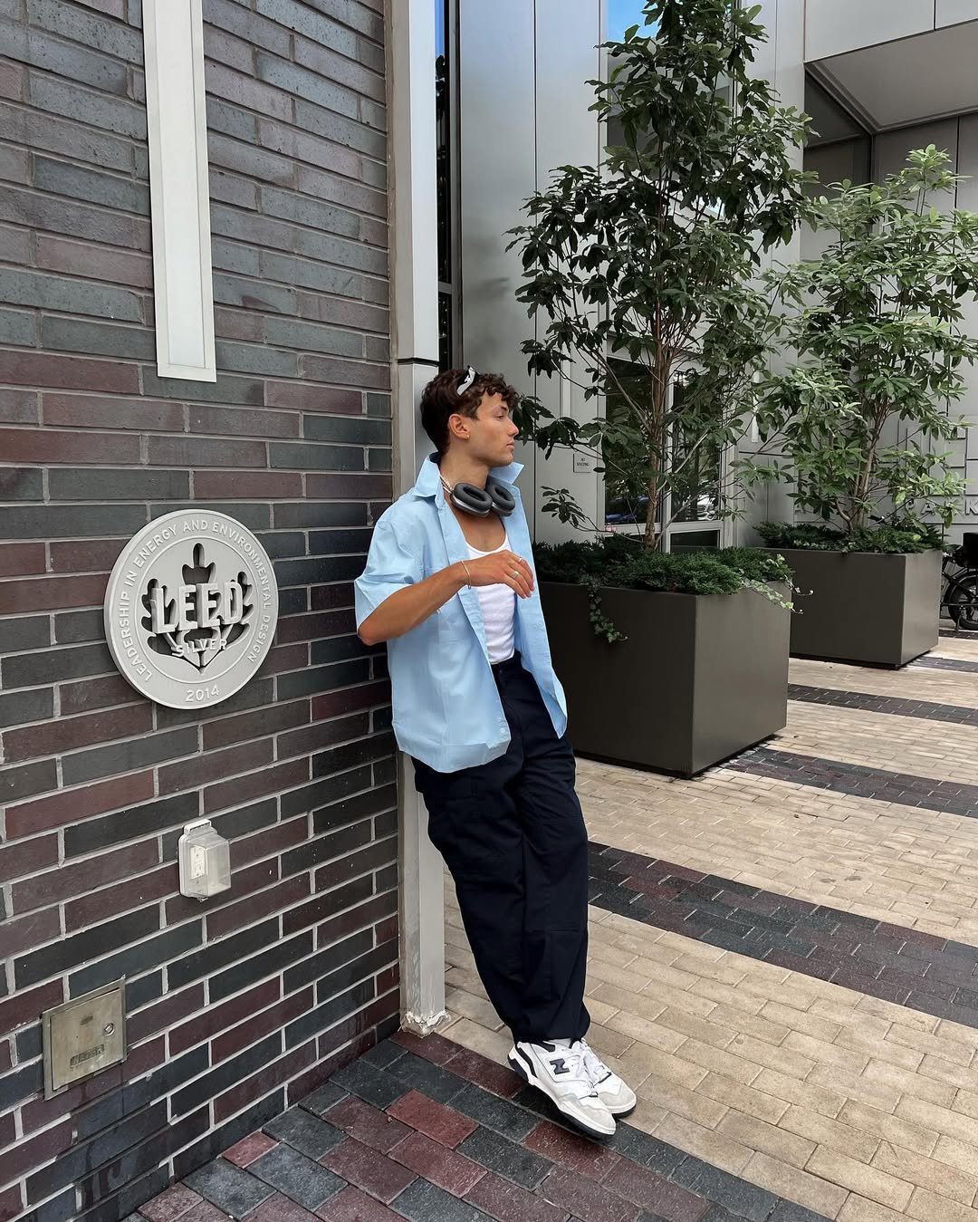 Open light-blue shirt, crisp white tank, relaxed trousers, and clean sneakers. It’s giving modern European summer energy without even trying. The headphones around the neck add that subtle lifestyle touch.