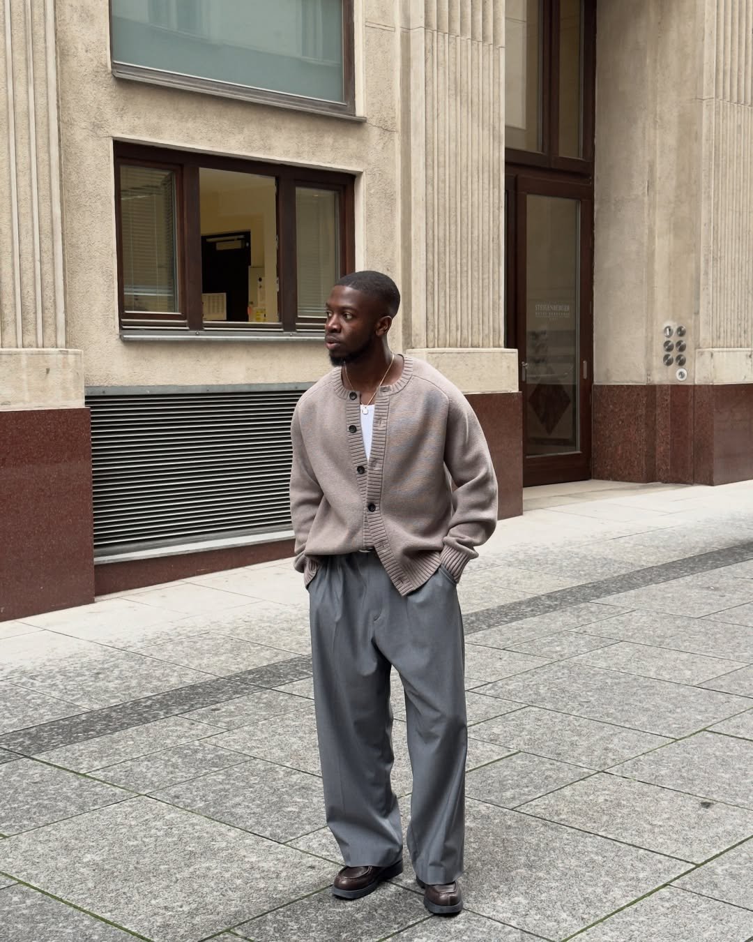 Taupe cardigan over a clean base layer with pleated grey trousers feels understated—but strong. The loose fit gives it movement, and the dark shoes anchor the palette perfectly.