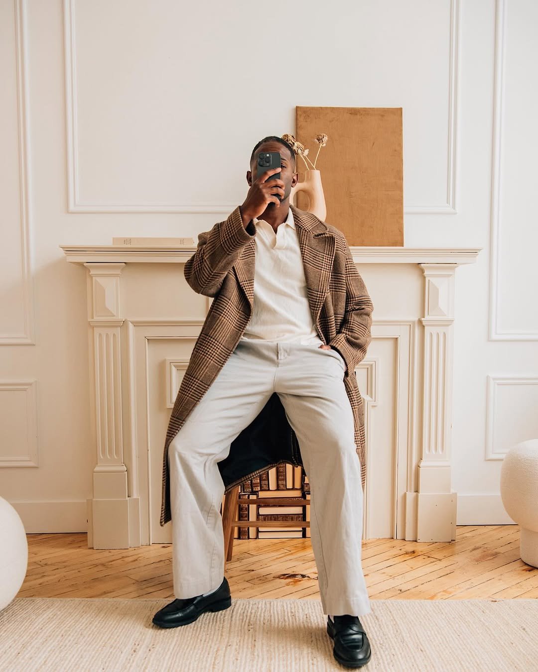 This is how you do modern gentleman without feeling dated. The plaid overcoat layered over creamy neutrals feels warm, refined, and totally intentional. Those wide-leg trousers add movement, while the black loafers keep it sharp.