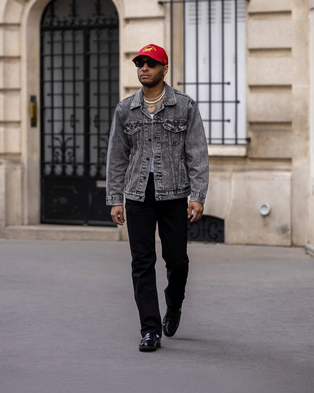 Denim jacket, black trousers, bold red cap. It’s simple pieces—but styled with intent. The layered chains and dark sunglasses add that subtle flex.