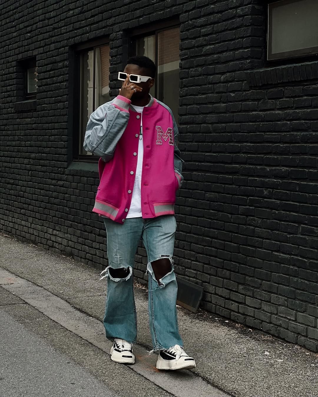 That pink varsity jacket against the dark brick wall? Instant main-character moment. The ripped wide-leg denim and chunky sneakers keep it grounded in streetwear, but the bold color choice is what really carries the look. It’s playful, confident, and not trying to blend in.