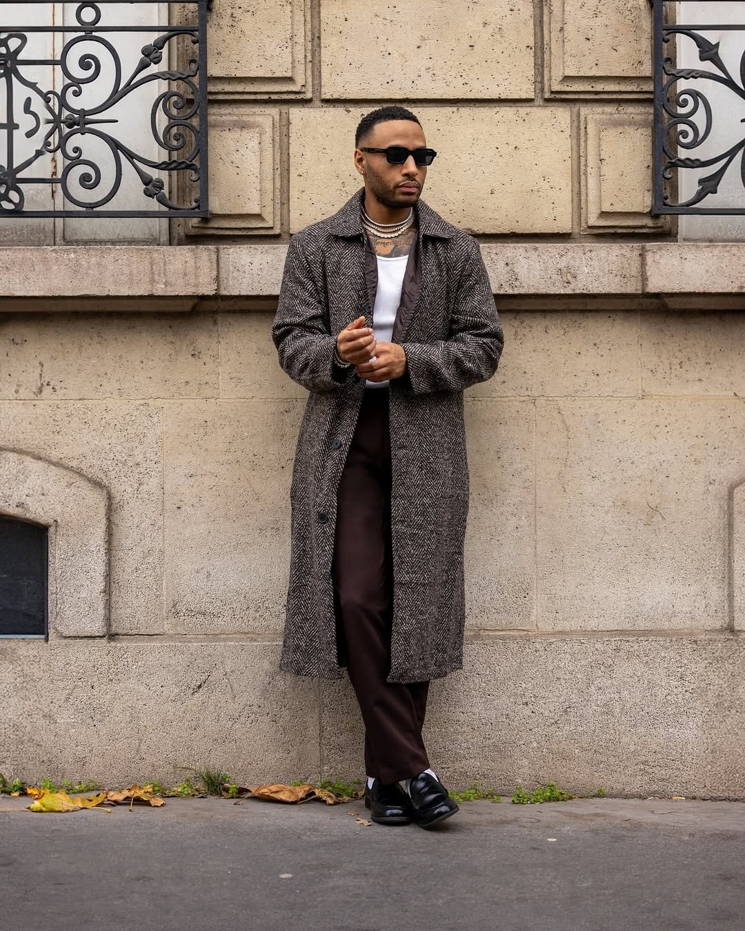 That long textured coat instantly upgrades the entire look. Paired with deep brown trousers and sleek loafers, it leans into refined street style territory.
