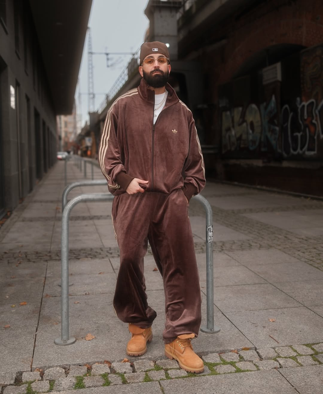 A chocolate brown velour tracksuit with tan boots shouldn’t work this well… but it absolutely does. The tonal stripes, layered chains, and fitted cap give it that early-2000s nostalgia, just sharpened for today’s streets. It’s relaxed, but still intentional.
