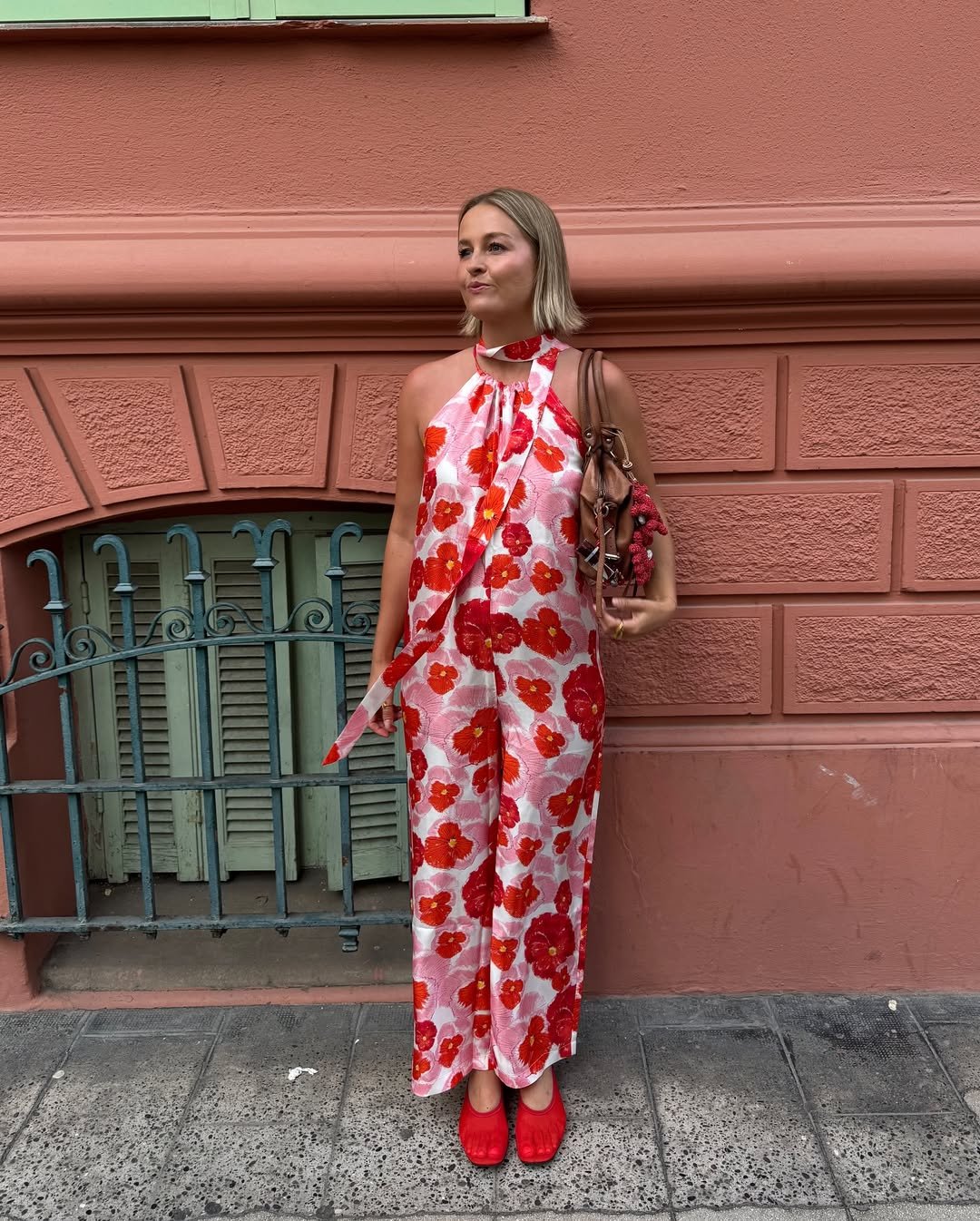 This outfit feels like a celebration of summer color. The vibrant red floral jumpsuit stands out beautifully against the warm-toned building, bringing that bold, statement-making energy that warm weather invites.