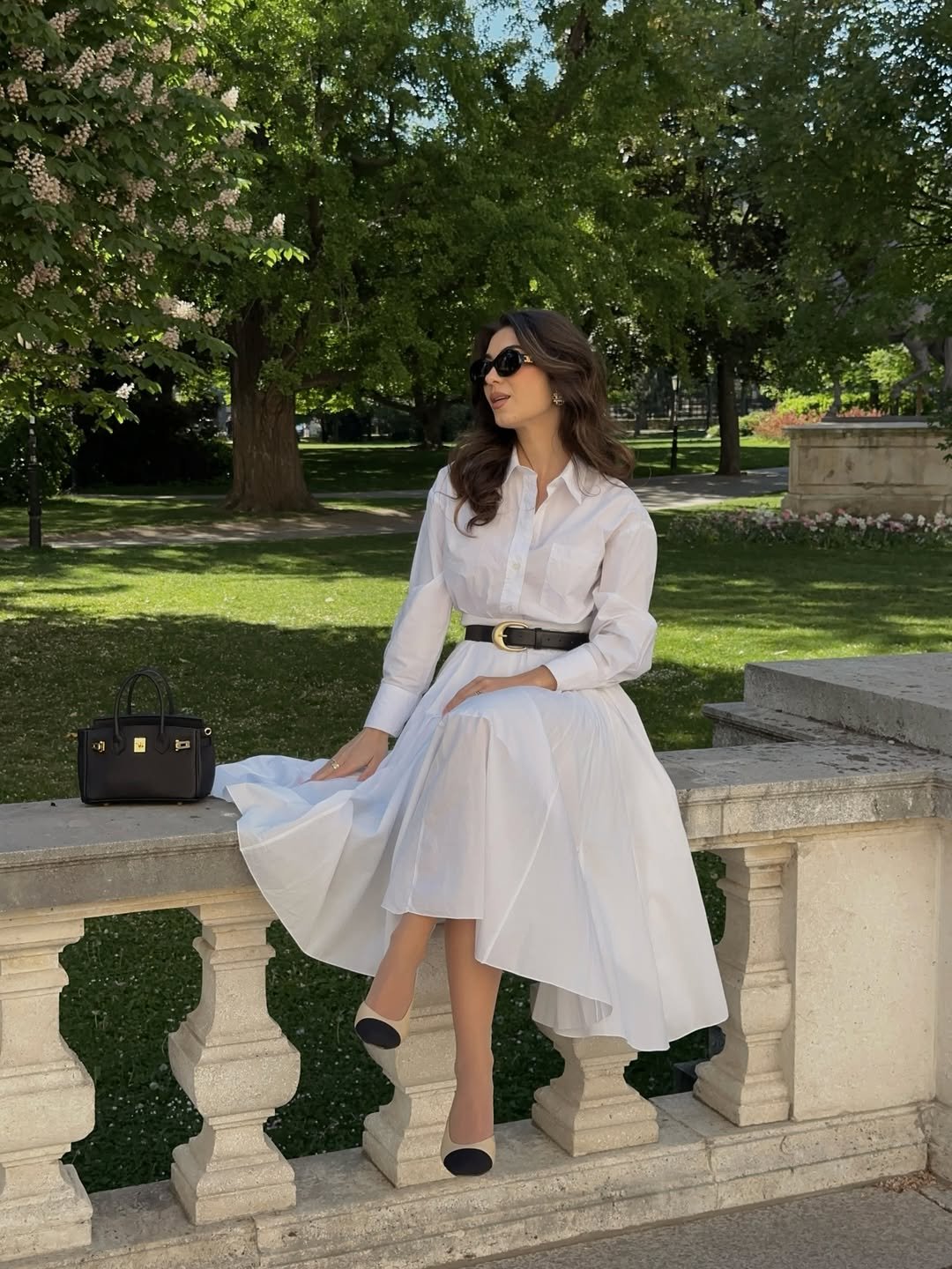 There’s something eternally chic about a crisp white dress in the middle of summer. The structured shirt-dress silhouette, cinched with a belt, creates that timeless look that feels elegant without being overly formal.