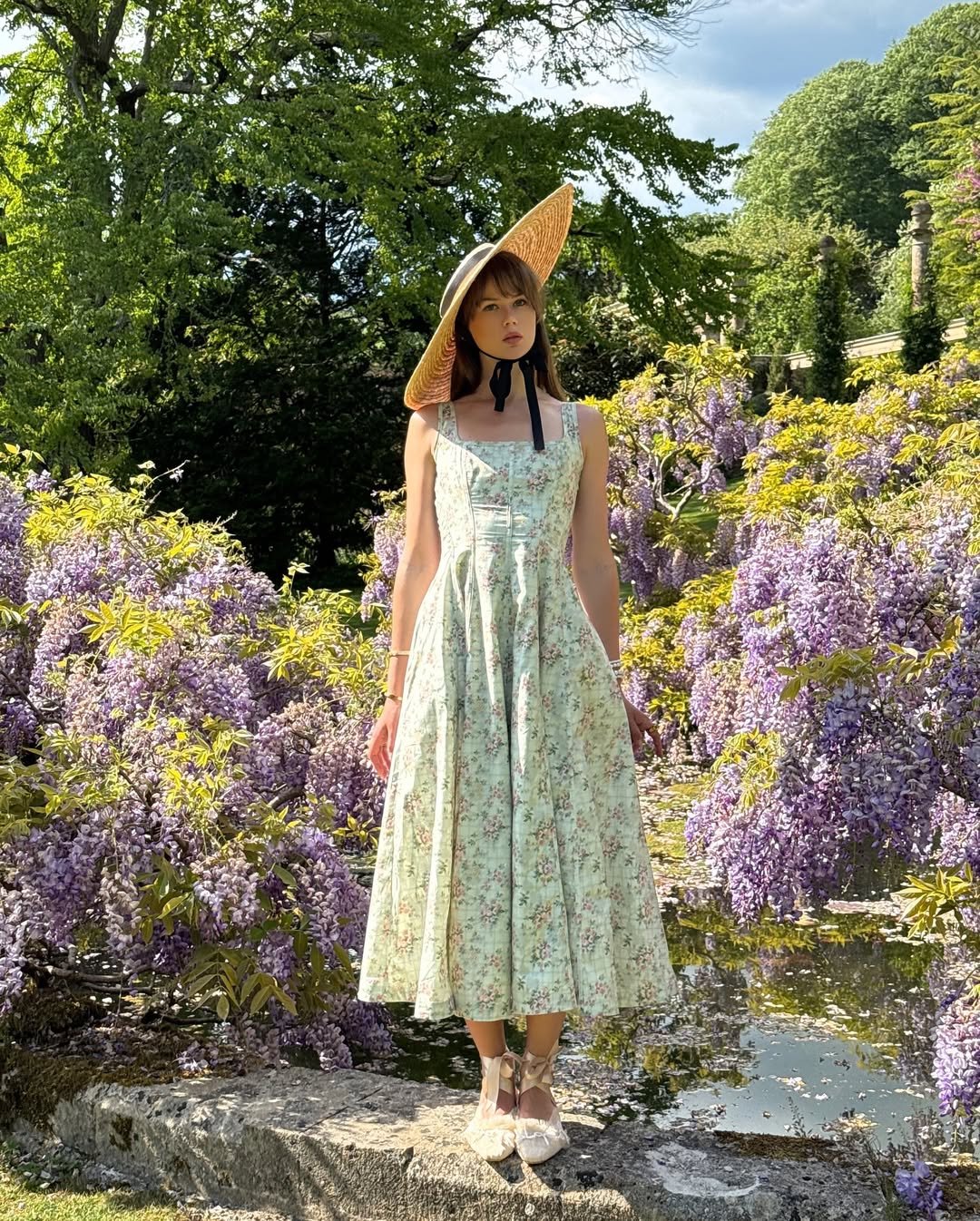 And the wide straw hat tied with a ribbon brings it all together. It’s romantic, peaceful, and the kind of outfit that makes a slow garden walk feel like a little event.