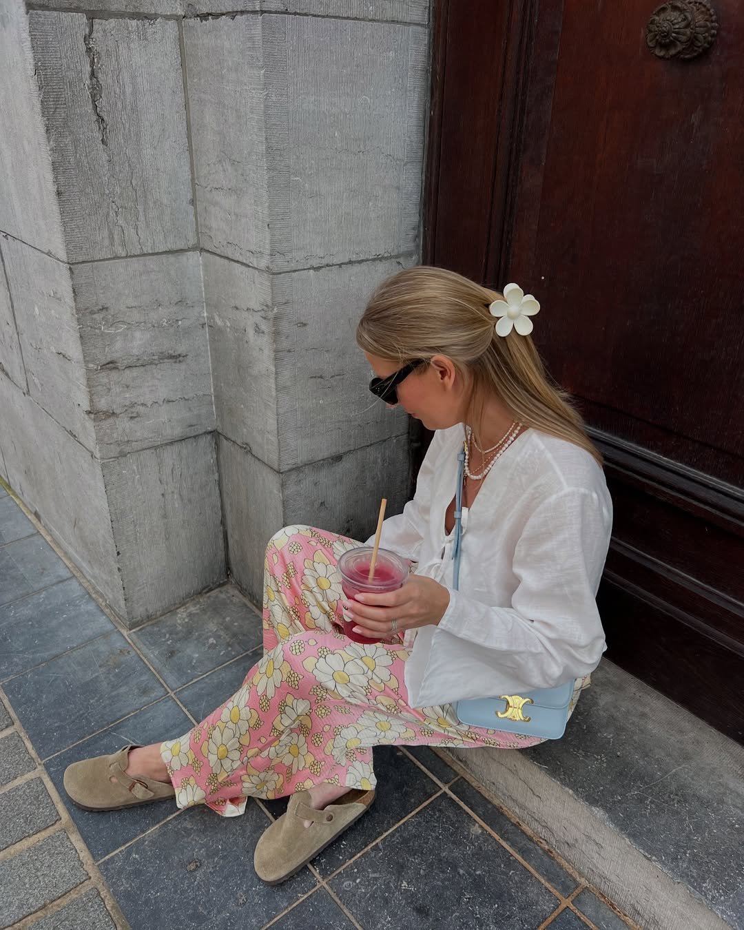 This outfit captures that quiet summer moment perfectly. A loose white blouse paired with soft floral trousers feels light, breathable, and ideal for a slow morning coffee break.