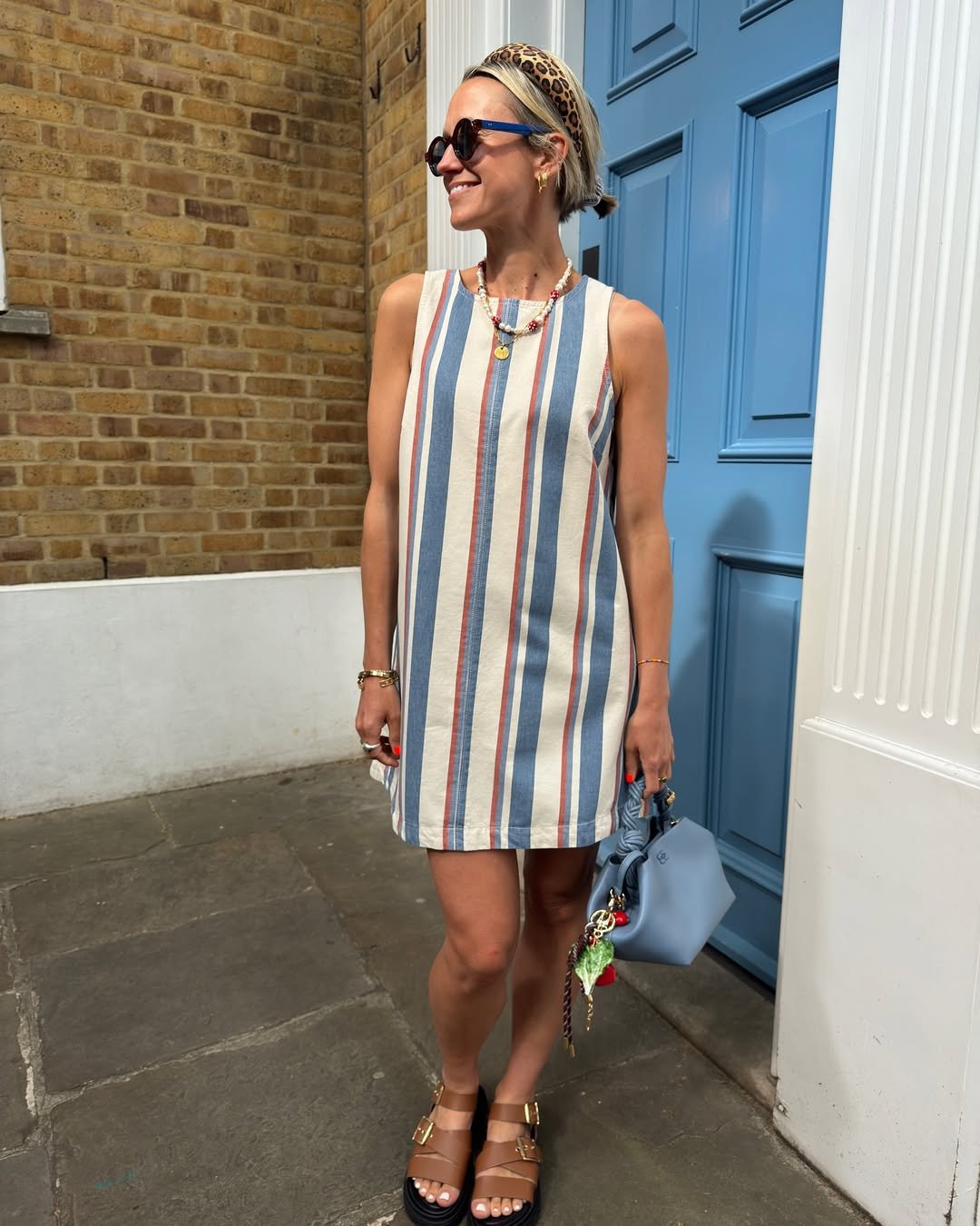 There’s something so effortlessly charming about a striped summer dress. The relaxed shift silhouette keeps things breezy, while the mix of blue and red stripes adds a playful coastal touch.