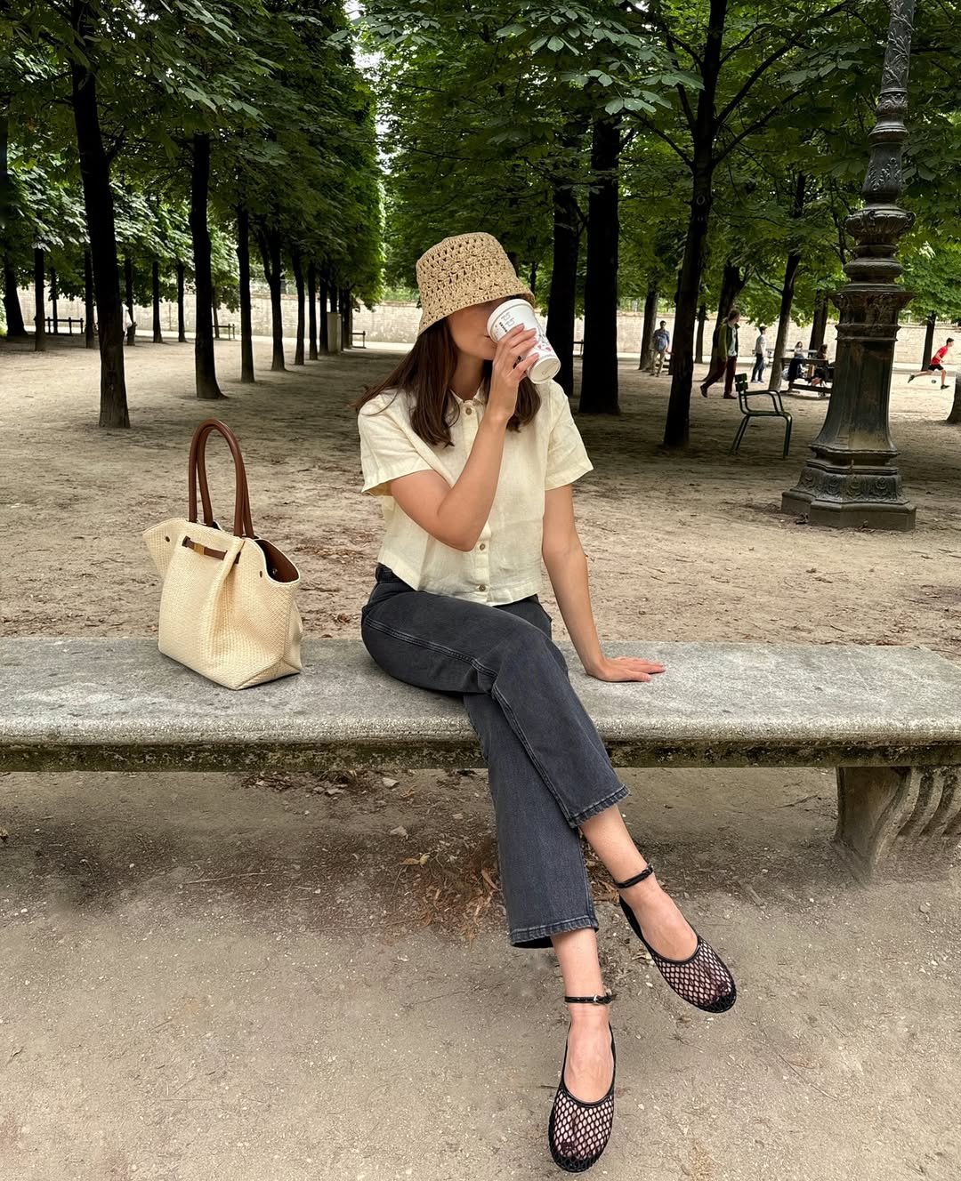 Sometimes summer style is just about the little rituals. A linen shirt, relaxed denim, and a woven bucket hat create the kind of easy outfit you throw on before heading out for a quiet park stroll.