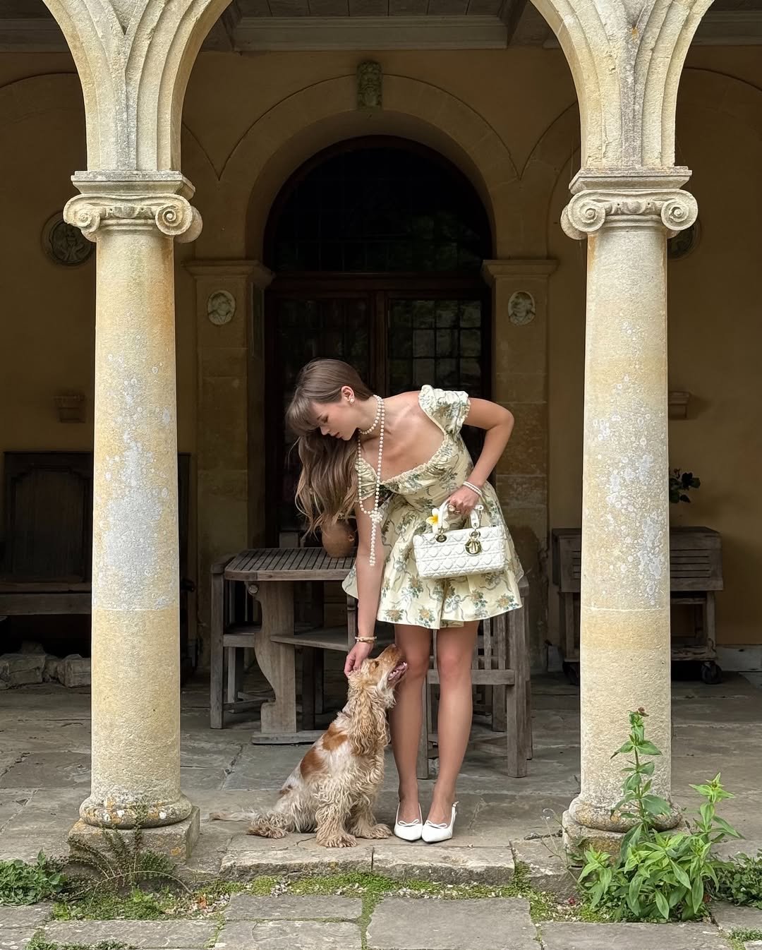 There’s something storybook-like about this floral mini dress moment. The soft green print, the delicate neckline, and that pearl necklace instantly bring a kind of vintage charm that feels timeless rather than costume-y.