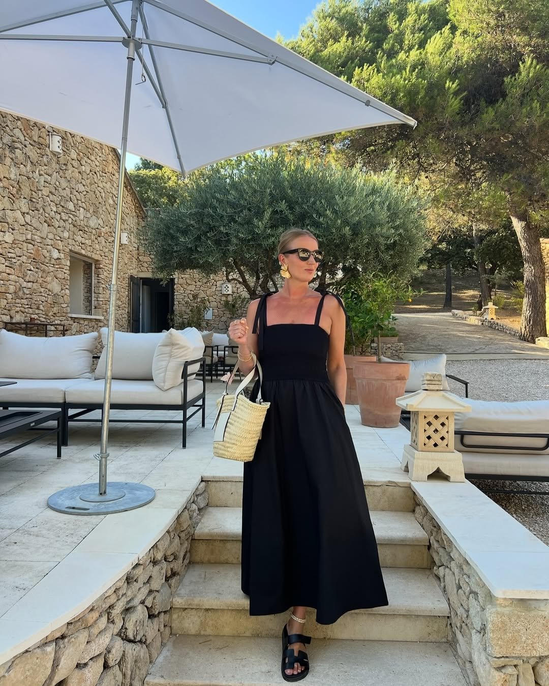 This black midi dress feels made for golden hour. The simple straps and flowing silhouette create an effortlessly elegant look, perfect for warm evenings spent outdoors.