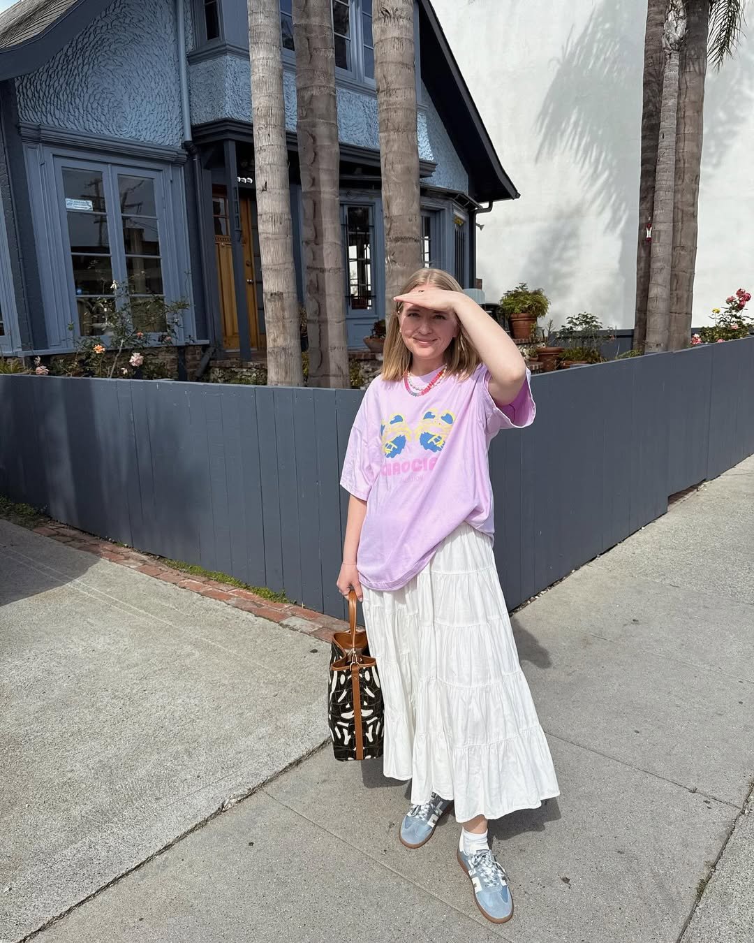 This outfit has that laid-back coastal feel, even on a sunny sidewalk. The oversized pastel tee paired with a flowing white skirt creates a silhouette that feels relaxed but still thoughtfully styled.