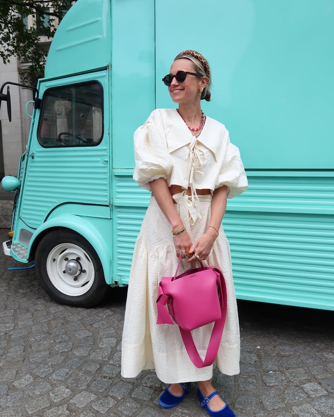 And then there’s that bright pink bag stealing the spotlight. Paired with cobalt flats and a turquoise backdrop, the whole look feels vibrant and joyful.