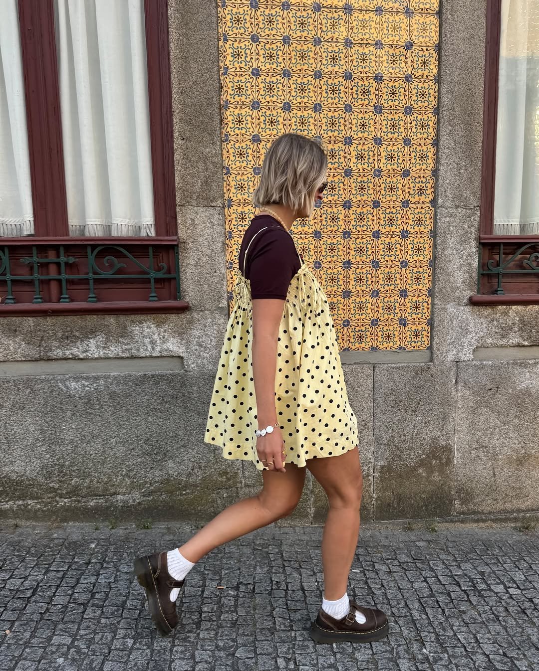 There’s something charming about mixing playful patterns with simple basics. This soft yellow polka-dot dress layered over a chocolate tee feels relaxed and a little nostalgic, almost like a modern twist on retro summer style.