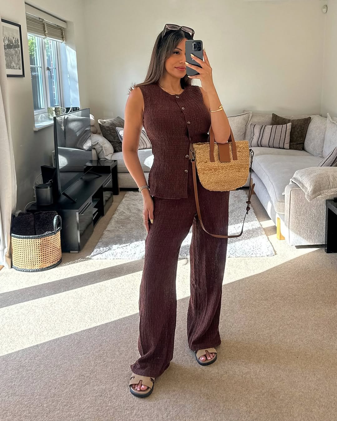 Matching sets always feel like a smart summer shortcut, and this textured chocolate two-piece proves it. The sleeveless top and relaxed trousers create a silhouette that’s polished but still comfortable enough for everyday wear.