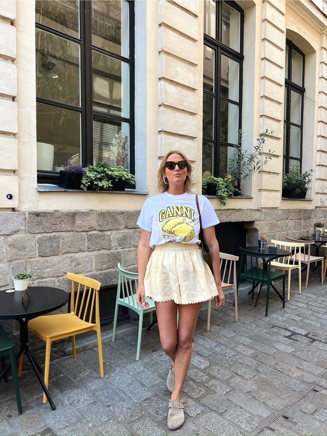 There’s something about pale yellow that instantly feels like summer in motion. Here, the soft lemon shorts paired with a graphic tee keep things playful, while the neutral loafers and crossbody bag quietly balance the look. It’s the kind of outfit that feels effortless strolling down a charming café-lined street.