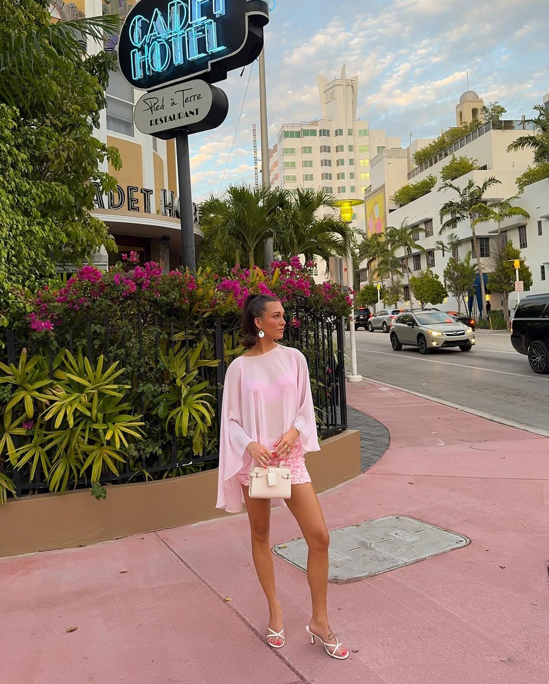 Some outfits just feel made for warm evenings and glowing city lights. This airy pink top draped over textured shorts brings that soft, romantic summer mood, the kind that feels right at home strolling past palm trees and art deco hotels.