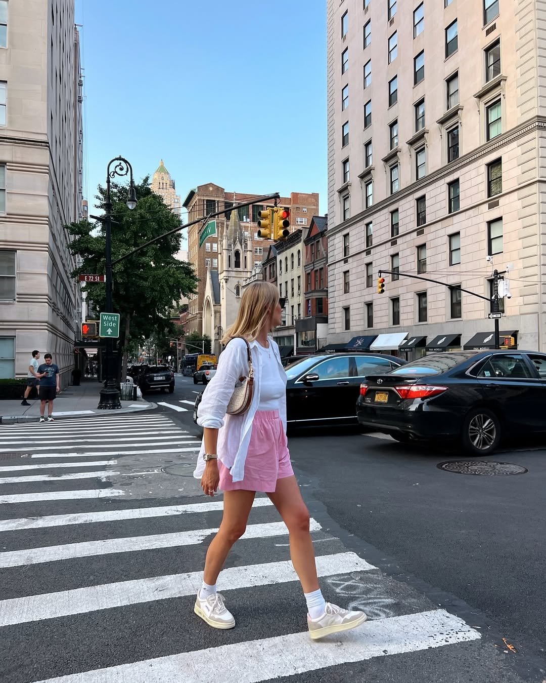 A classic white shirt and bubblegum pink shorts might be one of the easiest formulas for summer city style. The relaxed sneakers and shoulder bag give it that on-the-go energy, like someone heading to brunch before wandering through the neighborhood.