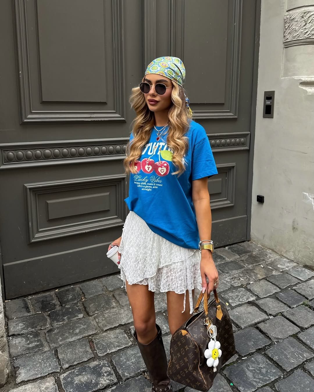 Graphic tees always bring a little attitude to an outfit, and this one pairs beautifully with the delicate white lace skirt. The contrast between casual and feminine gives the look a lot of personality.