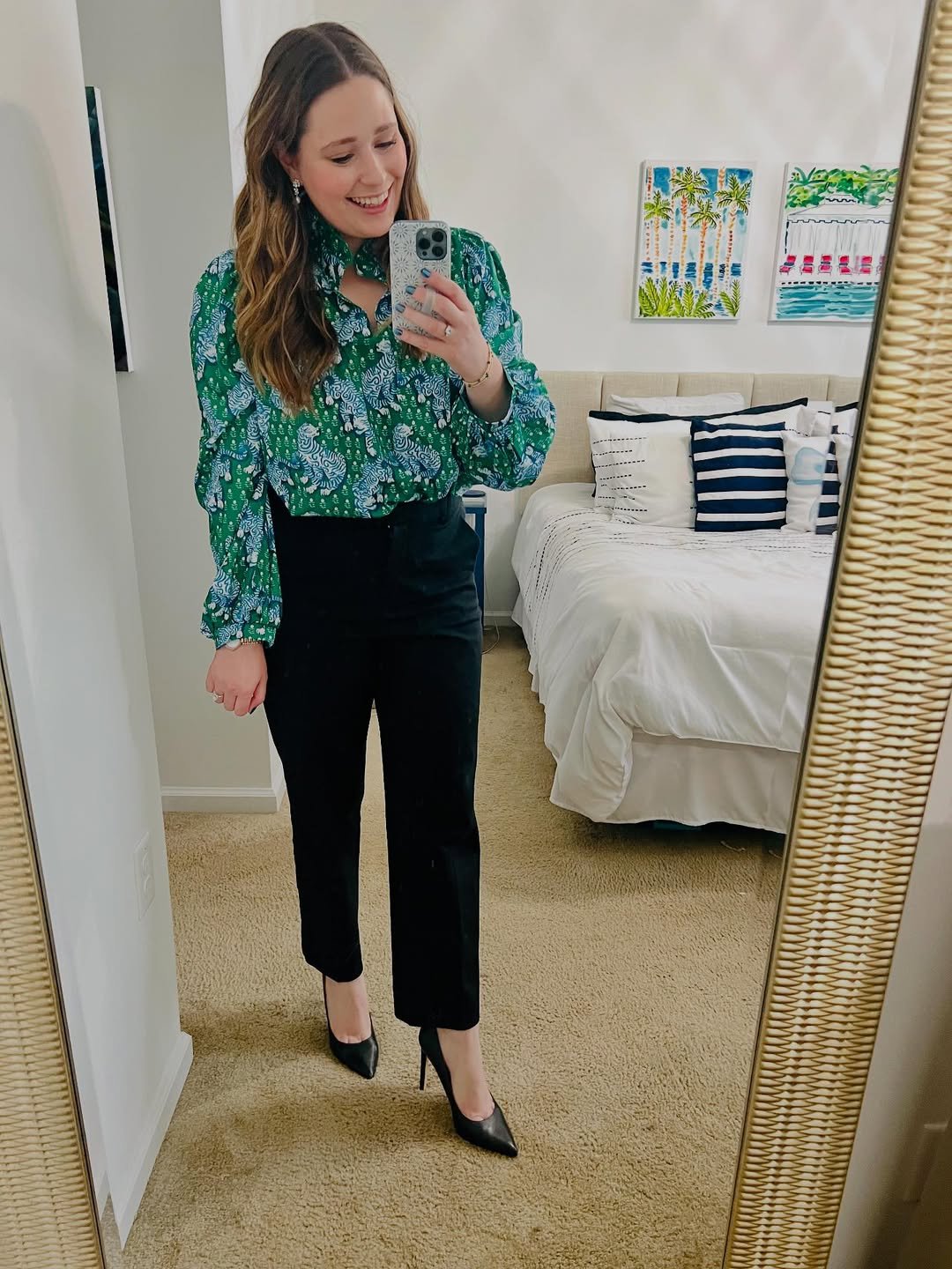 This look leans fully into bold pattern energy. The vibrant green blouse with playful prints instantly catches the eye, while the sleek black trousers keep everything feeling sharp and balanced.